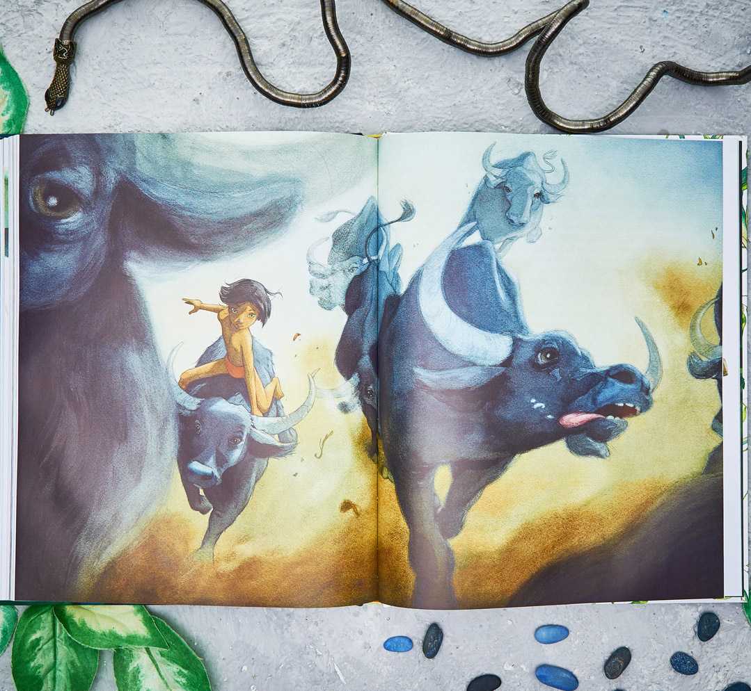 Иллюстрации к этой замечательной истории создал Квентин Гребан, встреча с творчеством которого — всегда праздник. Не полюбить такого Маугли просто невозможно! Рисунки — атмосферные, эмоциональные, динамичные. Кажется, что Багира вот-вот совершит прыжок, а Шерхан застынет в бессильном гневе при виде красного цветка.