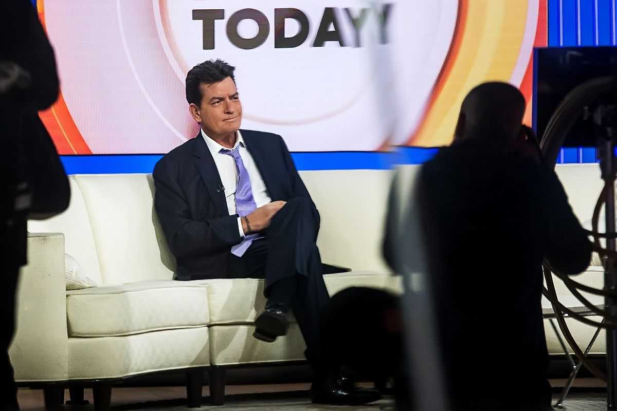 Чарли Шин на съемочной площадке шоу «Today Show», на котором он заявил о своем положительном ВИЧ-статусе в интервью Мэтту Лауэру, 17 ноября 2015 г.