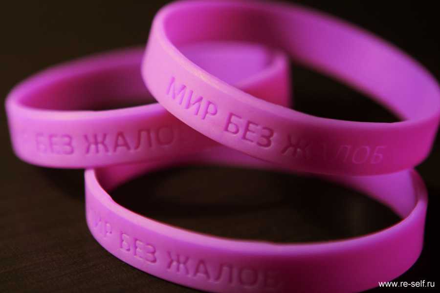 (силиконовый), который легко снять-надеть, чтобы поменять руку после очередной жалобы, приступа гнева/нытья. И можно не опасаться намочить браслет или еще каким-либо образом его испортить. Резиновый фиолетовый браслет очень легкий. Браслет выступает визуальным раздражителем, постоянно напоминая вам о том, что вы решили жить в мире без жалоб. Именно на свои руки мы смотрим чаще всего в течение дня.