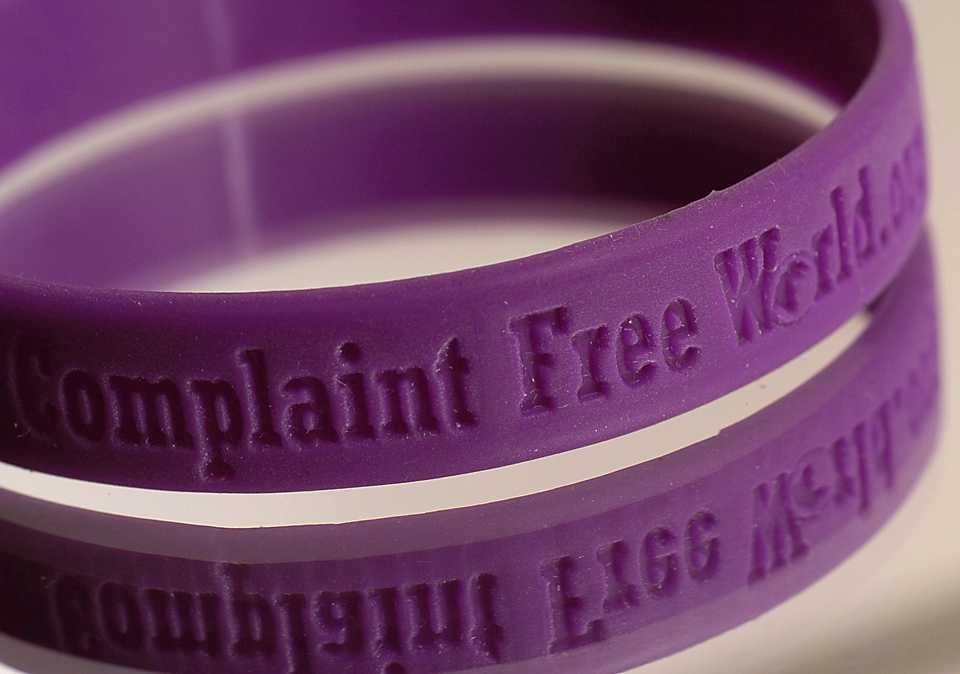 Авторы проекта «Мир без жалоб» выпустили целую серию браслетов фиолетового цвета, на которых написано название акции – «Complaint Free World». В психологии фиолетовый цвет ассоциируется с магическими свойствами, однако на самом деле это всего лишь символ. Цвет браслета может быть абсолютно любым. Лучше всего выбрать силиконовый или резиновый браслет, который удобно не снимать во время сна и занятий спортом.