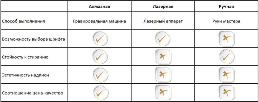 - Алмазная – буквы выдавливаются с помощью остроугольного алмаза. Надпись получается объемная, блестящая. В процессе не применяются химические вещества, поэтому она не стирается и не выгорает.