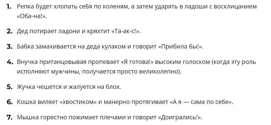 Суть конкурса: Каждому участнику раздают фразу, характеризующую его героя (кого именно играть, можно определить слепым розыгрышем). Далее ведущий читает оригинальный текст сказки, а актеры произносят свои фразы (можно дополнять любыми действиями) каждый раз, когда упоминают их героя. Победителя определяют зрители, оценивая насколько оригинально участник представил своего героя.