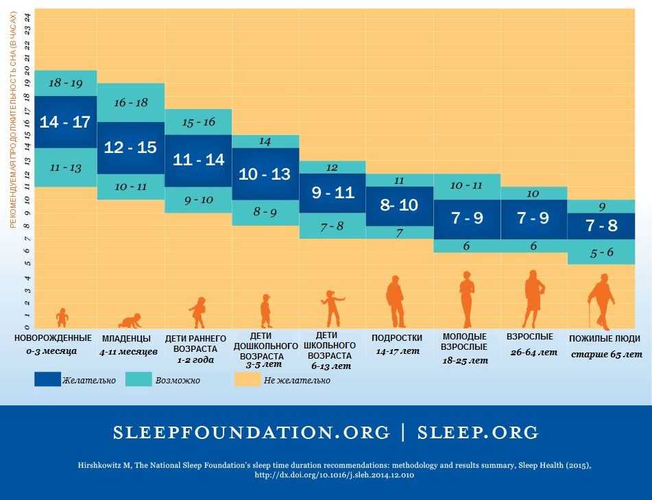Если не знаете, сколько необходимо спать по времени, то обратите внимание на нижеприведенные данные:
