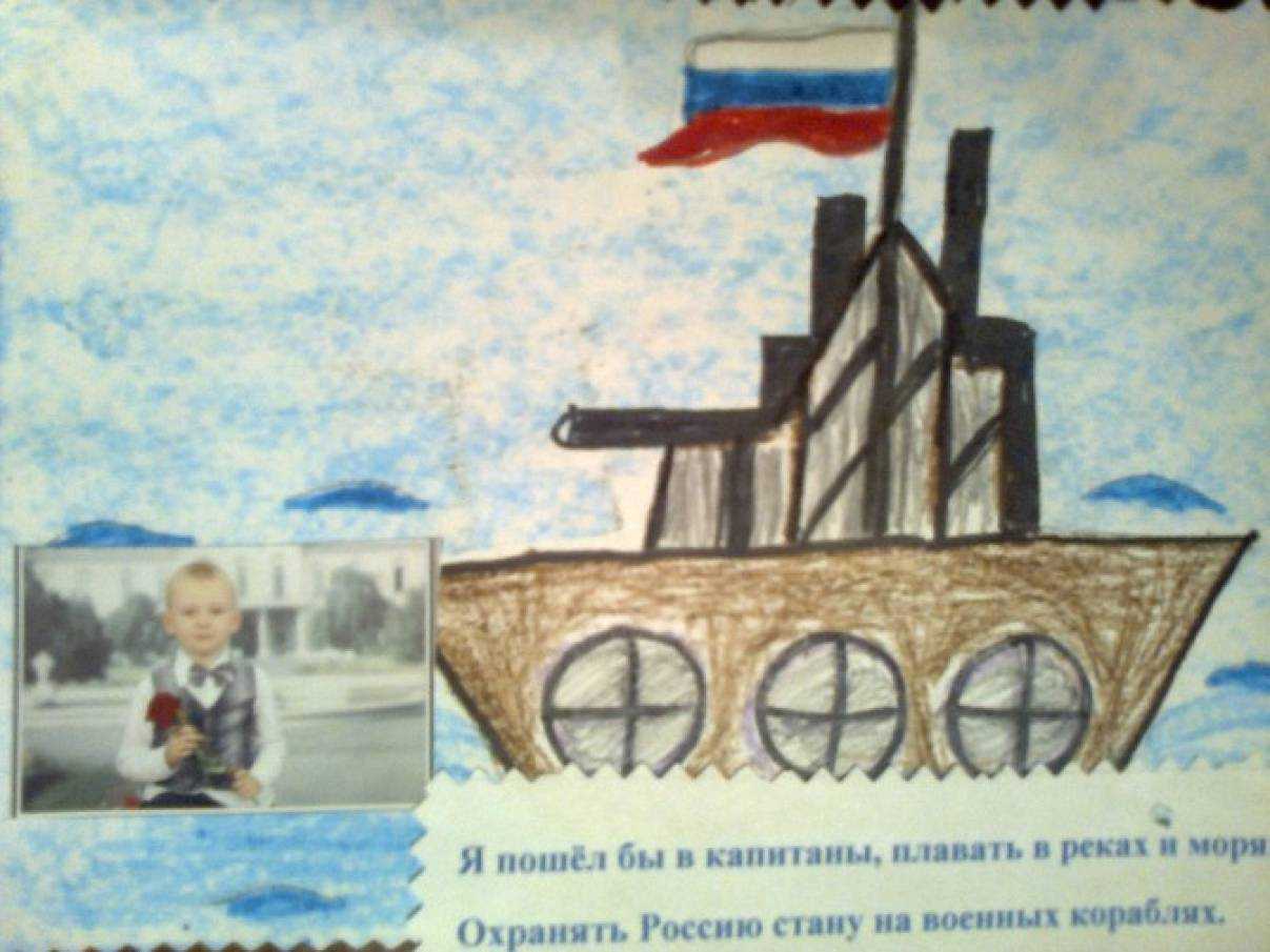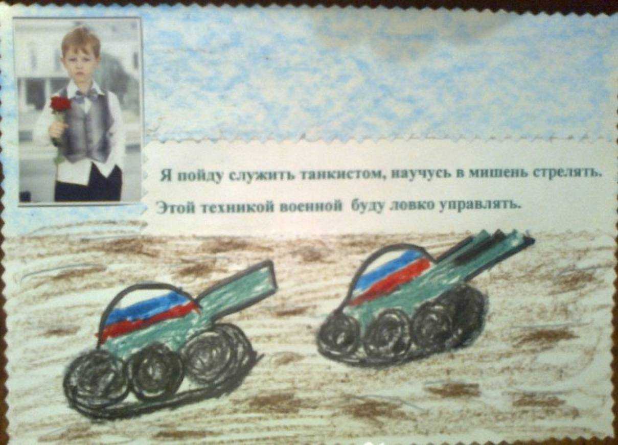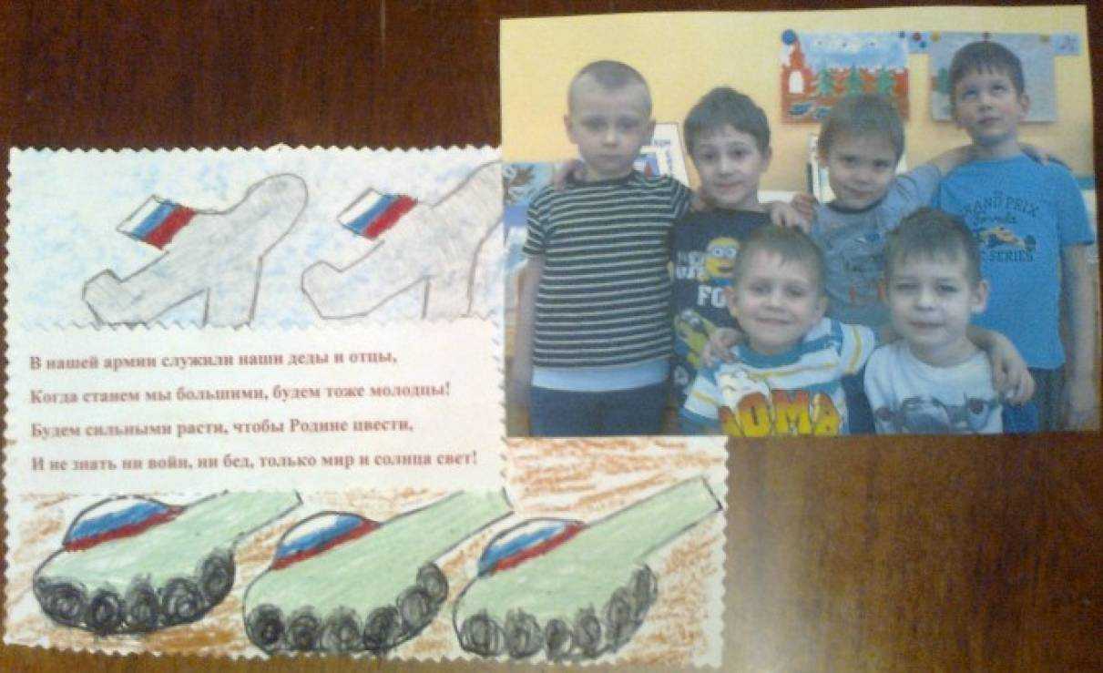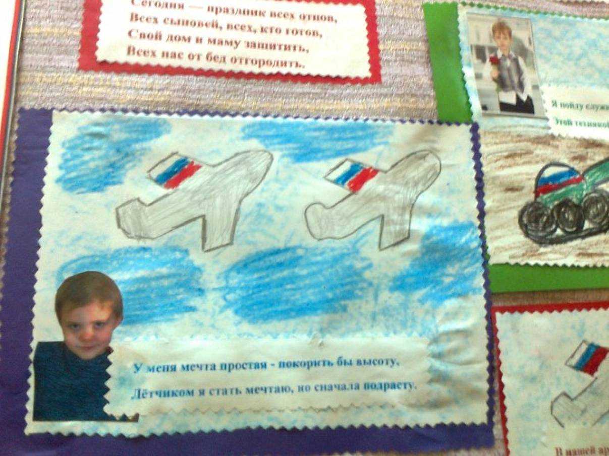 Ребята нарисовали, используя трафареты, военную технику: самолёты, танки, корабли. Мальчишки рисовали свои «мечты». «Мечты» ребят мы подкрепили их фотографиями и стихами, которые выучили к празднику.