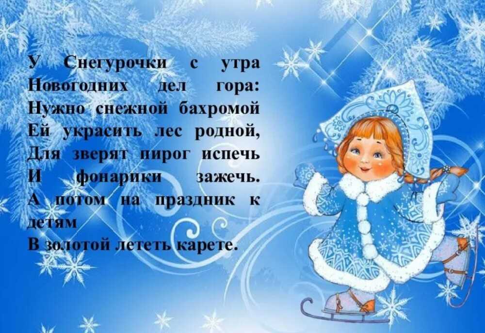 Я – дочурка снега, вьюги, я дитя суровых зим.Я красива, очень статна. Образ мой неотразим!Обожаю хороводы, звонко песенки поюИ подарки всем детишкам вместе с дедом раздаю.