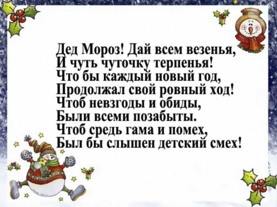 Чудесный праздник мы встречаем,Все вместе елку украшаем,Мороз за щёчки всё кусает —Так часто в Новый год бывает,Но главное — пора веселья,И хорошего настроения,Всех игр, забав и хороводов,И криков: «Праздник к нам приходит»!Желаем всем здоровья, счастья,И не грустить, а улыбаться,Слушать родителей, стараться,Тогда все будет получатся!