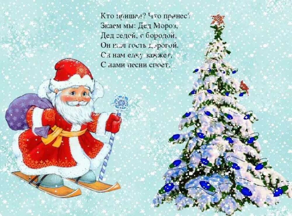 Его по шубе примечаем:С ним мы не плачем, не скучаем,С ним очень весело всегда!У Дед Мороза — борода,Большие чудо-рукавицы,В мешок ныряют будто птицы,Подарки ловко достают,И щедро детям раздают.