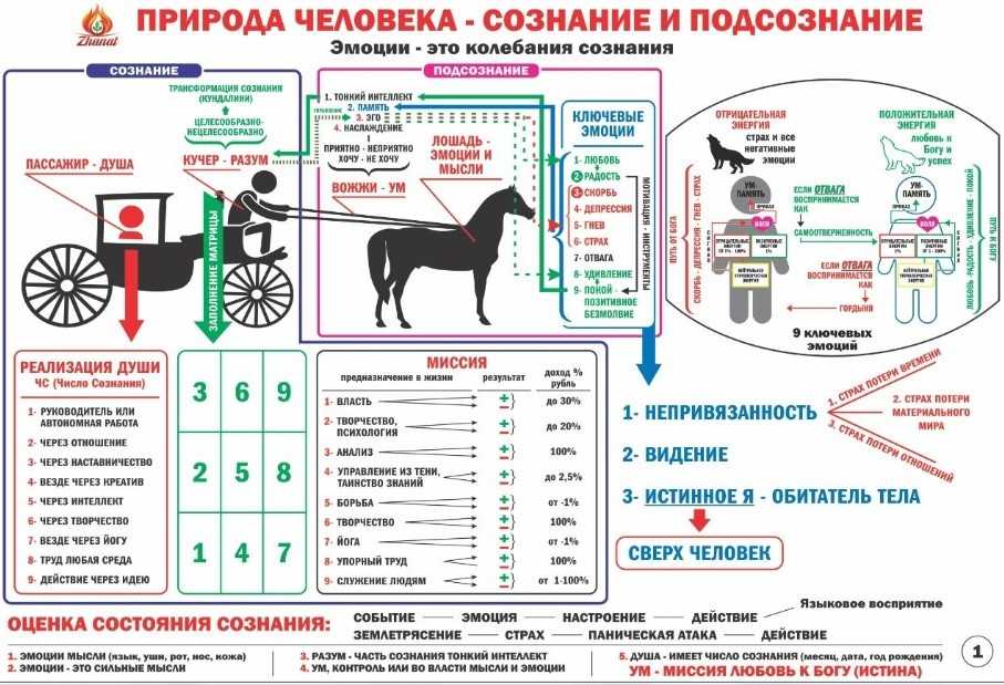 Что будет с пассажиром, если его не будет вести кучер (разум)? Нет, он не остановит свое движение, но только его путеводителями будут эмоции и мысли, которые часто приводят не туда, куда нужно. Чтобы войти в правильную колею, человеку нужно действовать, исходя из состояния «целесообразно-нецелесообразно», т.е. научиться погружаться в разум и уметь управлять сознанием и подсознанием одновременно .