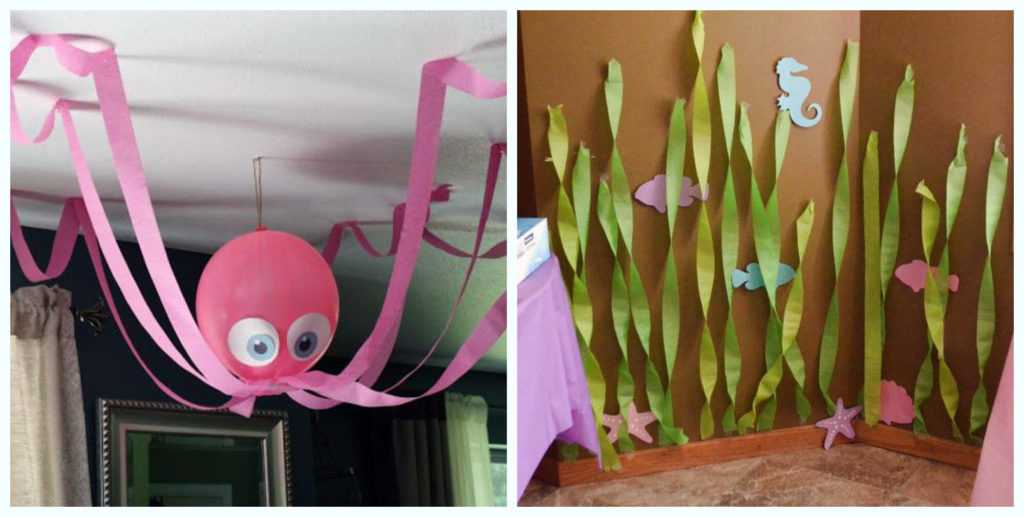 Как только Вы определились с темой, можно придумать какие декорации подойдут лучше всего. Если «Русалочка», то повесьте на потолок воздушные шары в виде обитателей морских глубин, а стены украсьте бумажными водорослями.