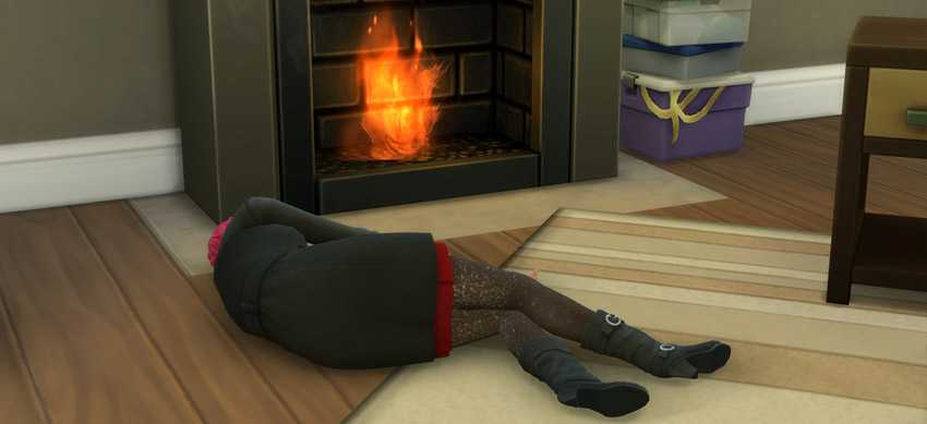 - Смерть от огня — Любой сим, который стоит в огне достаточно долго, может умереть. Самый простой способ добиться этого — разжечь огонь в камине или у костра и поиграть с огнем или приготовить еду на кухне с низким навыком кулинарии. Как только комната загорится, пока сим не покинет комнату и не потушит огонь, он может быстро умереть от огня.