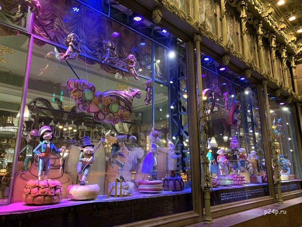 На углу Малой садовой и Невского проспекта, как раз где начинается ярмарка на Манежной, находится знаменитый магазин Купцов Елисеевых. Можно сказать, что это продовольственный магазин-музей с одной из самых красивых витрин в Санкт-Петербурге. Обычно там делают «селфи».