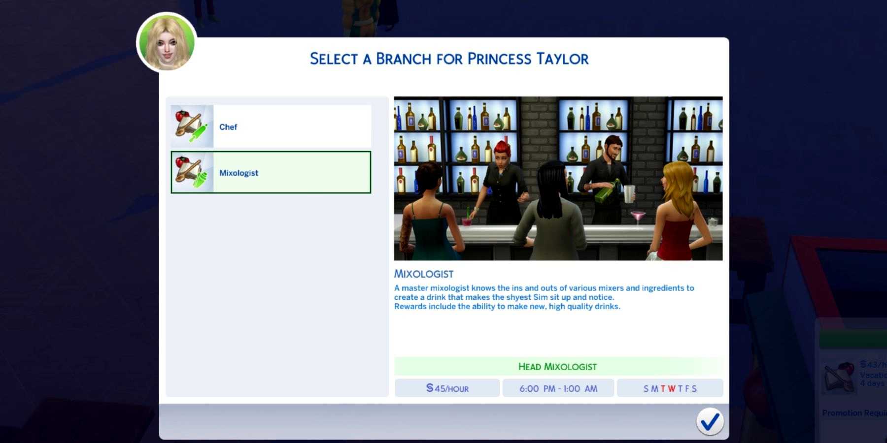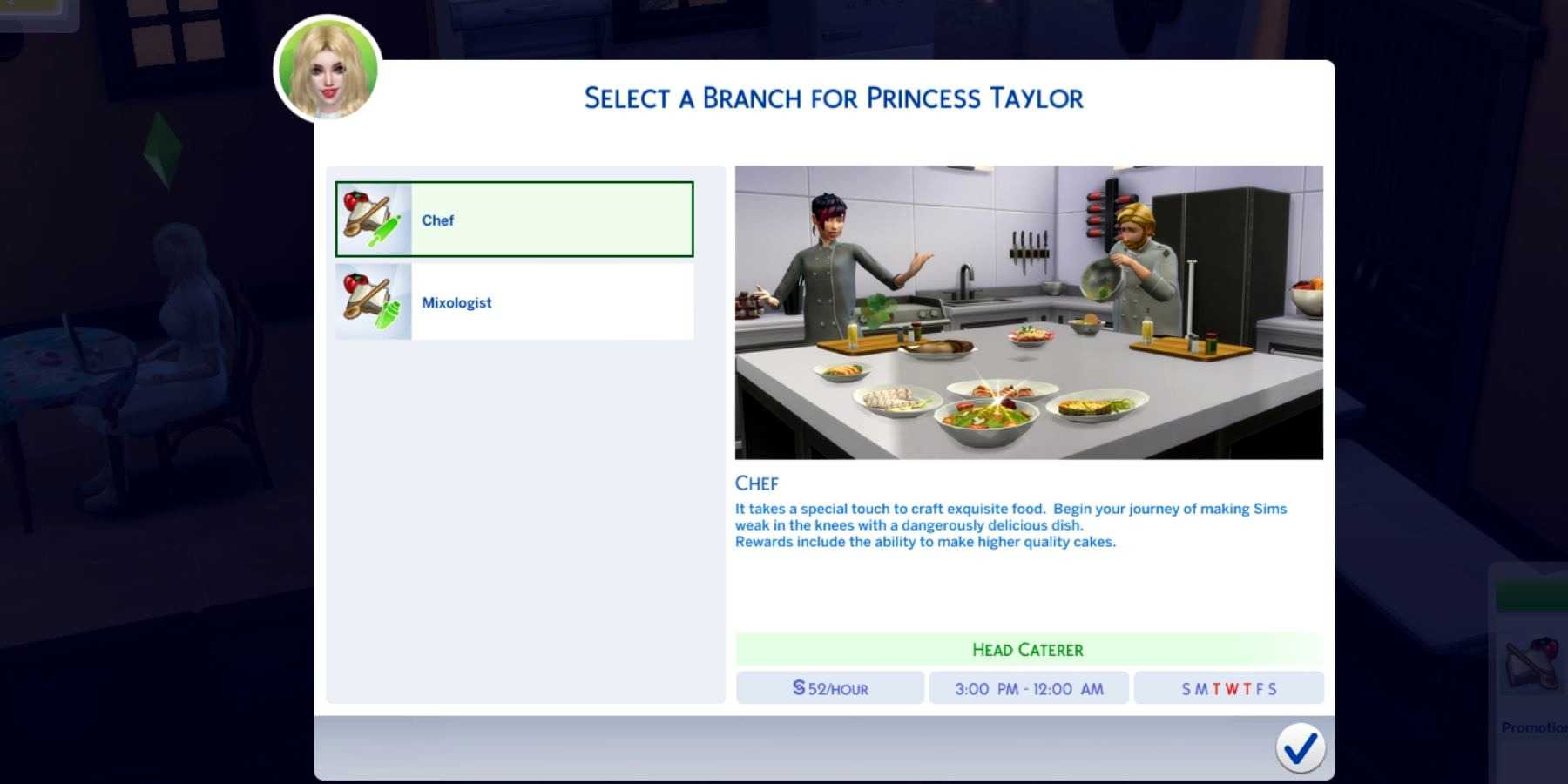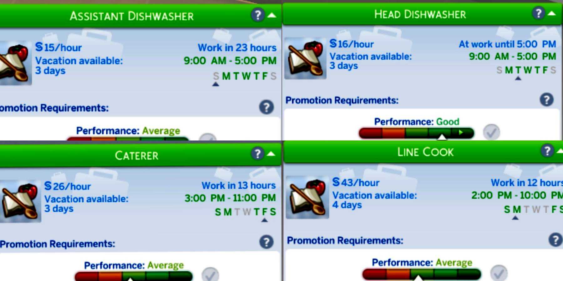 Чтобы быстрее получить повышение, игроки должны заставить своих симов усердно работать когда они уходят на работу, так как это увеличит счётчик производительности. По достижении шестого уровня карьера кулинара разделится на две ветви: «Повар» и «Кулинар». Шеф-повар и Миксолог ветвь. Симеры могут выбрать ту, которая соответствует стремлению их сима, будь то стать лучшим поваром или миксологом.