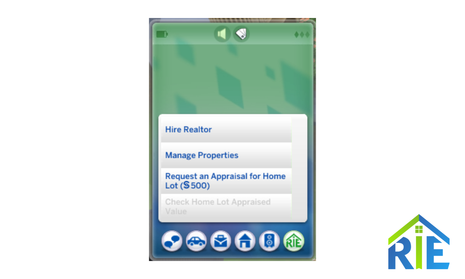 Everything will appear normal when you first log in to a new game. You can buy or rent your Sim’s first place as usual with EA prices. Existing saves will also have the same experience. R|E doesn’t step onto the scene until you actively engage the Mod with its very own phone menu. This menu will allow you only to Hire a Realtor or Request an Appraisal for Home Lot at the beginning.