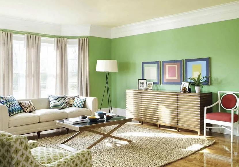 Фисташковая гостиная комната с приятным окрашиванием стен