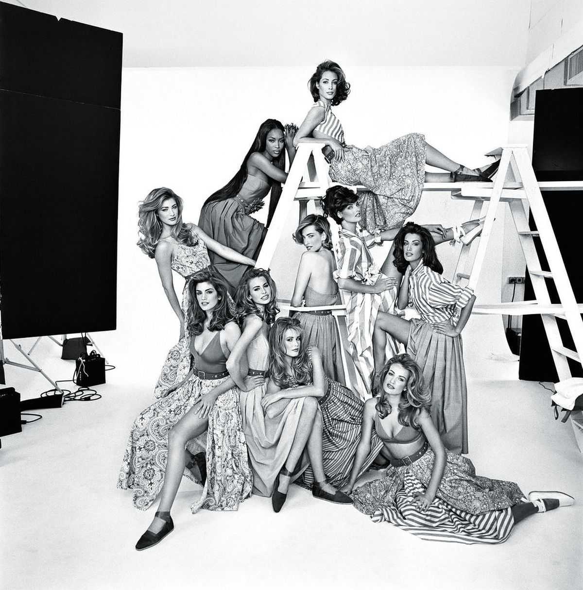 Сверху вниз: Кристи Тарлингтон, Наоми Кэмпбелл, Илэйн Ирвин, Линда Евангелиста, Татьяна Патиц, Ясмин Гаури, Ники Тейлор, Синди Кроуфорд, Клаудия Шиффер, Карен Александр