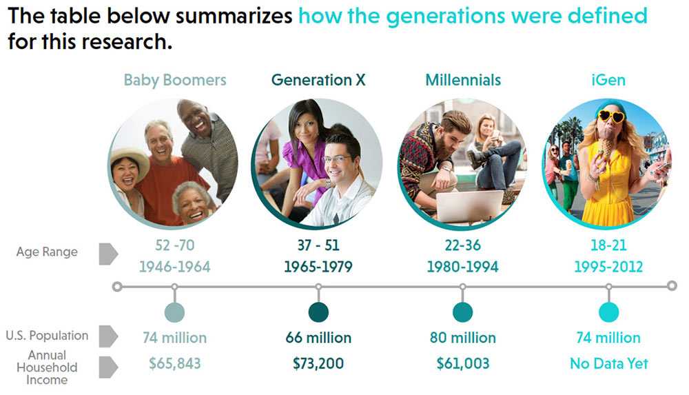Классификация поколений: «Бэби-бумеры», «Поколение Х», «Миллениалы», «iПоколение». Внизу по горизонтали указано количество представителей каждого поколения в США и годовой доход их семей.