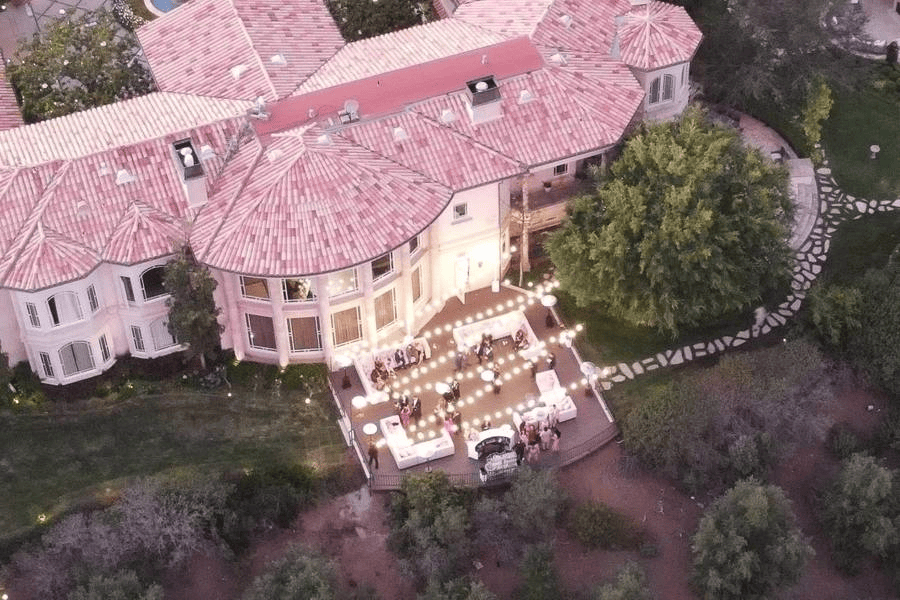 В итоге певица предпочла привычную домашнюю атмосферу экзотической локации и провела свадебную церемонию в стиле диснеевской Золушки в своем доме в калифорнийском городке Таусенд-Окс. Особняк, напоминающий римские палаццо, довольно живописен и эффектно смотрится на свадебных фото и видео: колонны, стрельчатые окна, резные балкончики, балюстрады, восхитительный окружающий ландшафт. Для церемонии на прилегающей к дому территории соорудили большой шатер, крытый розовым шелком, украшенный живыми цветами и драгоценными люстрами. Внутри располагалась цветочная арка-стена из зелени, розовых и белых роз, деревянные скамьи для приглашенных. В цветовом оформлении свадьба Бритни Спирс-2022 традиционна: певица отдала предпочтение нежной бело-розовой, кремовой и золотой гамме. Цветочными гирляндами украсили также:
